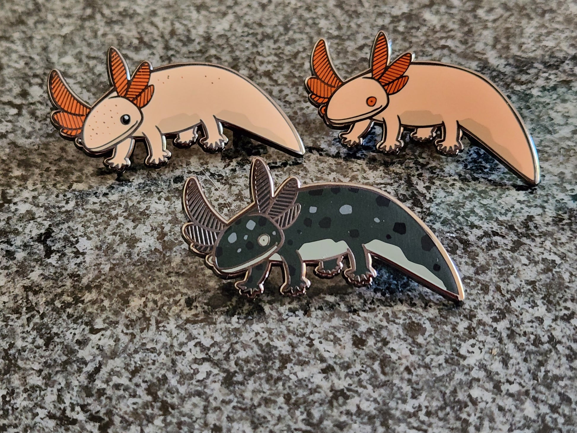 Hard enamel pins featuring one of the world's most popular salamanders, the axolotl (Abystoma mexicanum)! These beautiful pins have screen printed details for maximum wow factor.