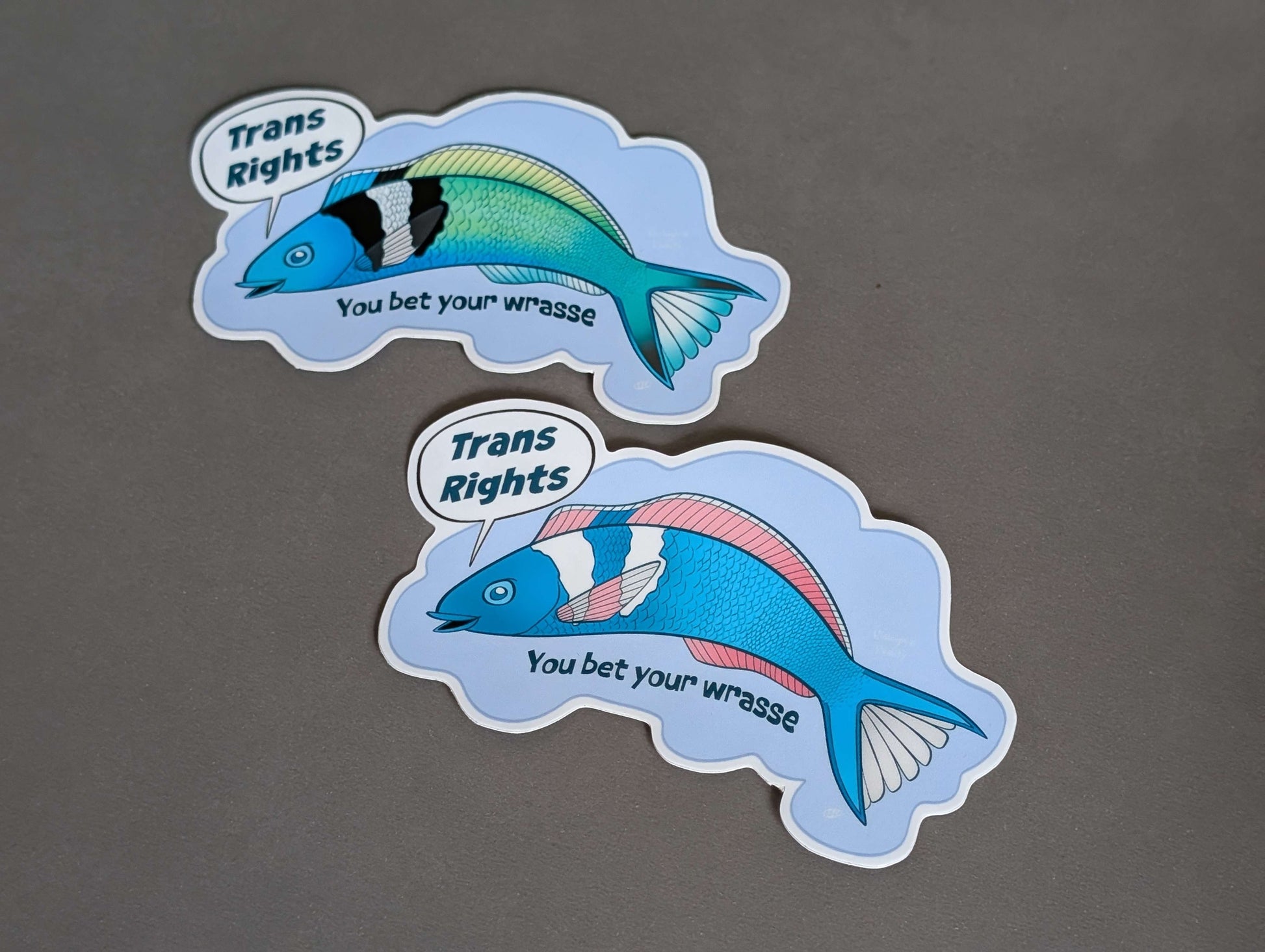 You bet your wrasse we support trans rights. Many wrasses (members of the family Labridae) are sequential hermaphrodites, typically beginning their lives as female fish but eventually becoming male fish. This sticker is nearly four inches long, in durable vinyl for indoor or outdoor use.